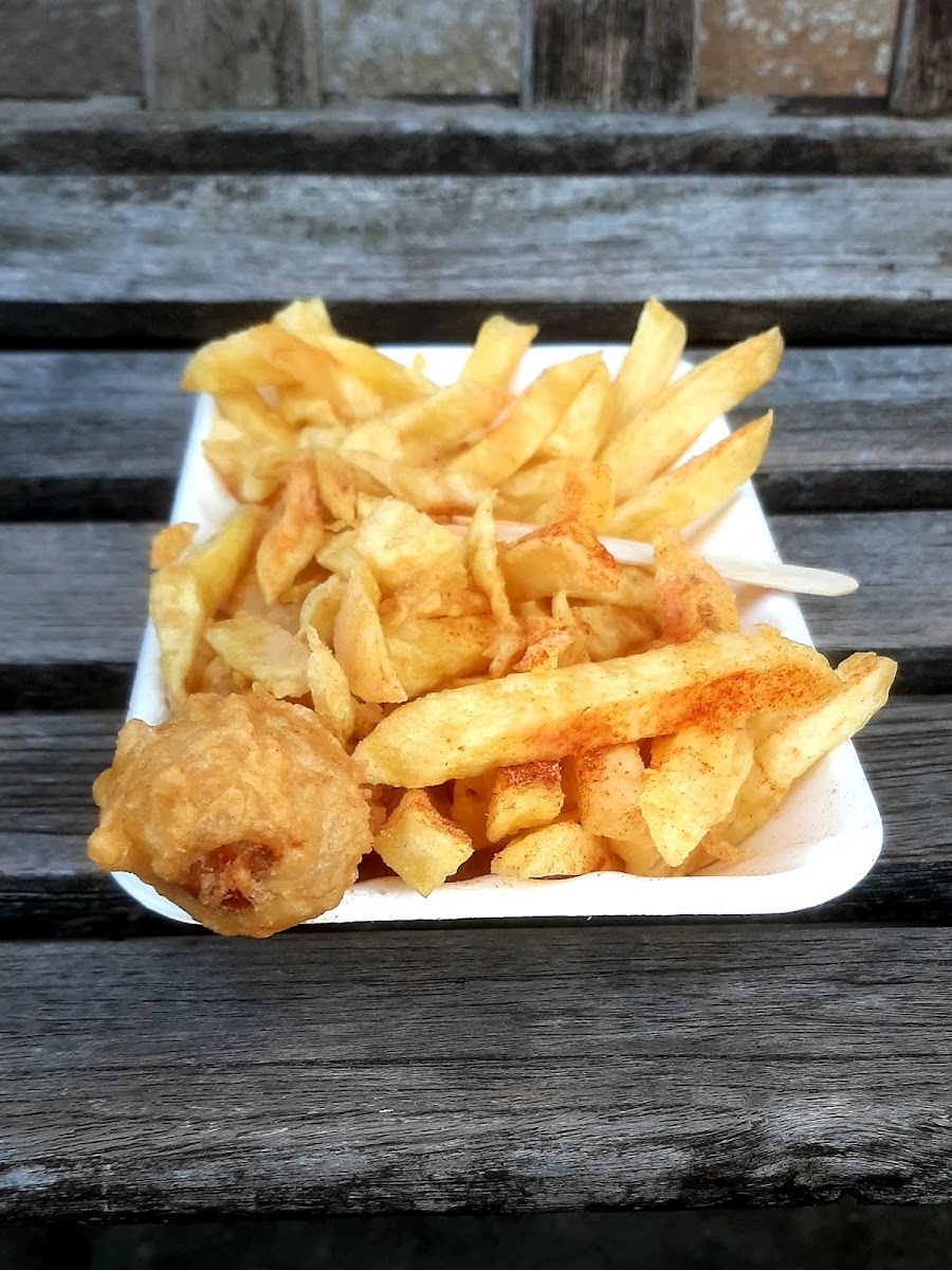 Lovely Fish & Chip Stall on Norwich Market (est 1971). I order gluten free Mini Fish deal for £6.50 and it's cooked to order. The deal comes with curry sauce and I was offered g/f gravy instead. I had a slice of lemon. Best gluten free fish I've had anywhere, really light and deliciously crisp. Great value. Friendly, helpful staff. Sitting area at the rear of the Stall (No 60). Vegan options available.